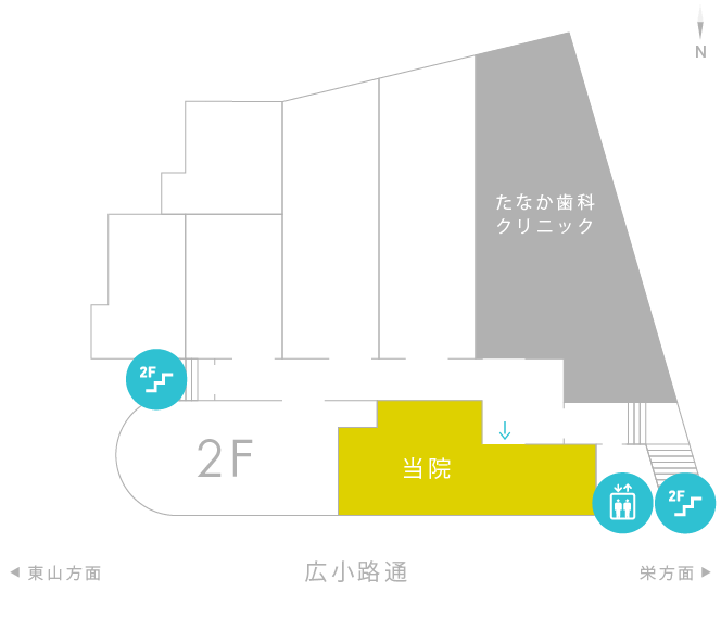 左側に「覚王山フランテ」さんの駐車場を見ながら進み、白いフェンスの道路向かいにある「覚王山センタービル専用駐車場」が、当院の駐車場です。